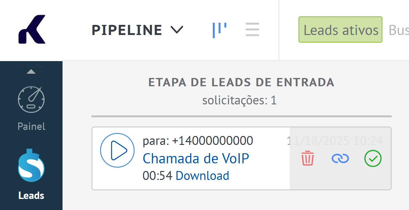 A Kommo oferece aos gerentes a possibilidade de realizar chamadas à partir do cartão de qualquer contato, empresa ou lead, através de um simples clique no número de telefone dentro do cartão.