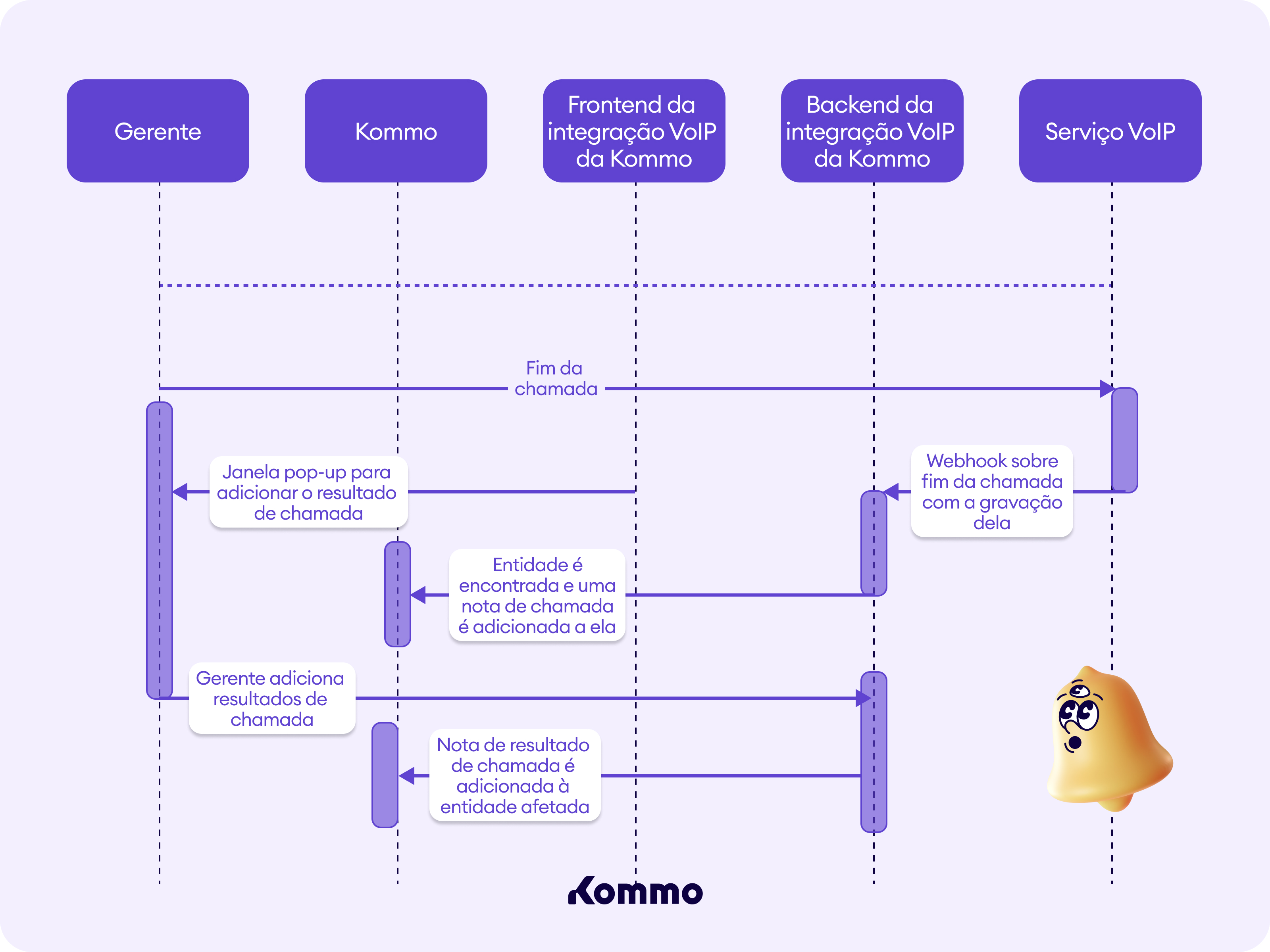 - Nesse tutorial, nós consideramos que a integração receberá um webhook do serviço VoIP assim que a chamada acabar. Um webhook sobre o fim da chamada é enviado à partir do serviço VoIP. Em seguida, o backend da integração precisa encontrar a entidade correspondente (lead, contato ou empresa), ou criar um lead de entrada caso não exista uma entidade vinculada ao número na sua conta Kommo.