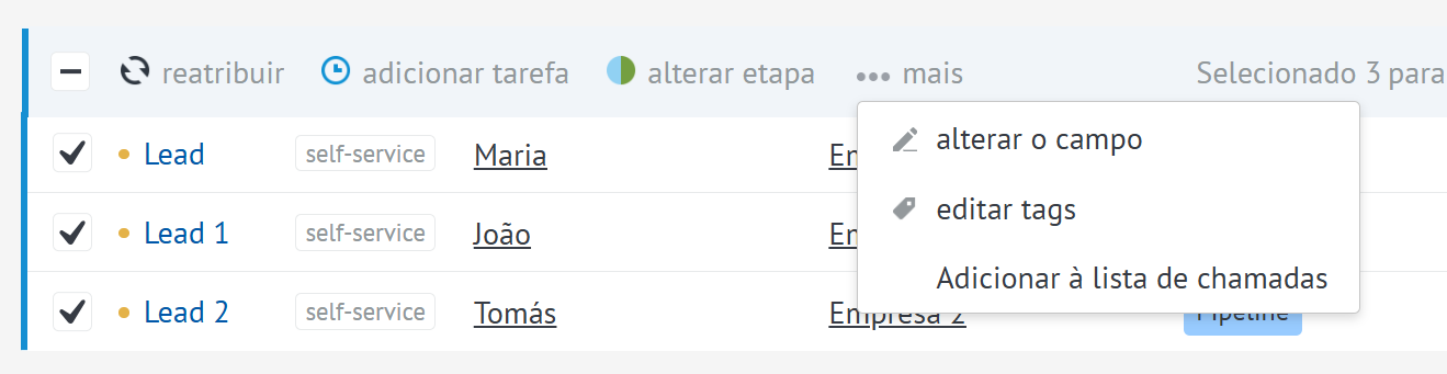 As listas de chamadas podem ser geradas a partir das páginas de Contatos, Empresas e Leads. Para criar uma lista, selecione as entidades desejadas e adicione-as à lista de chamadas através do menu Mais.